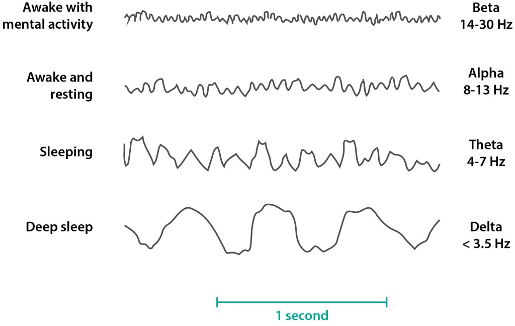 This is quite a detailed representation of an EEG reference frame. Displayed are the general wave patterns for individuals in different cognitive states, which scientists use to observe the patient’s alertness